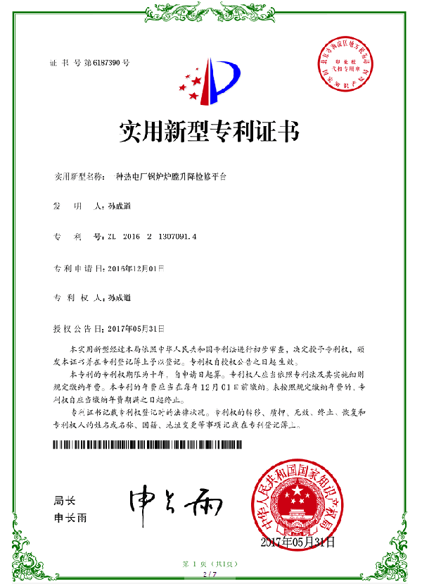 新聞中心下支撐折疊式鍋爐爐膛檢修平臺行業首項國家專利發明者